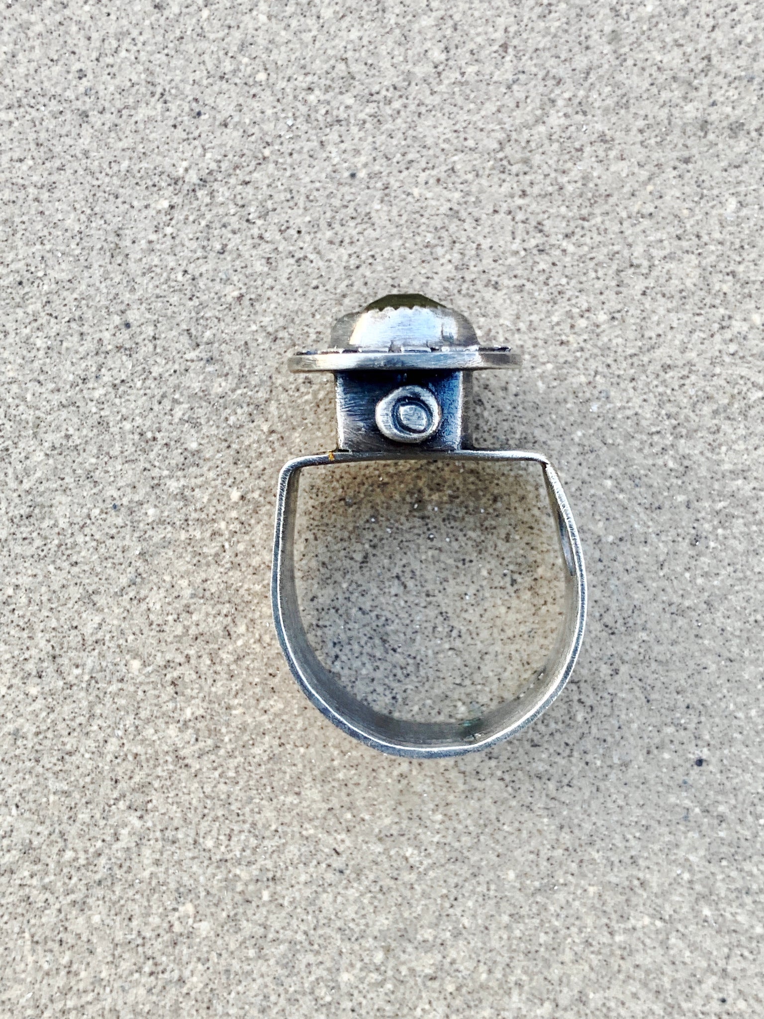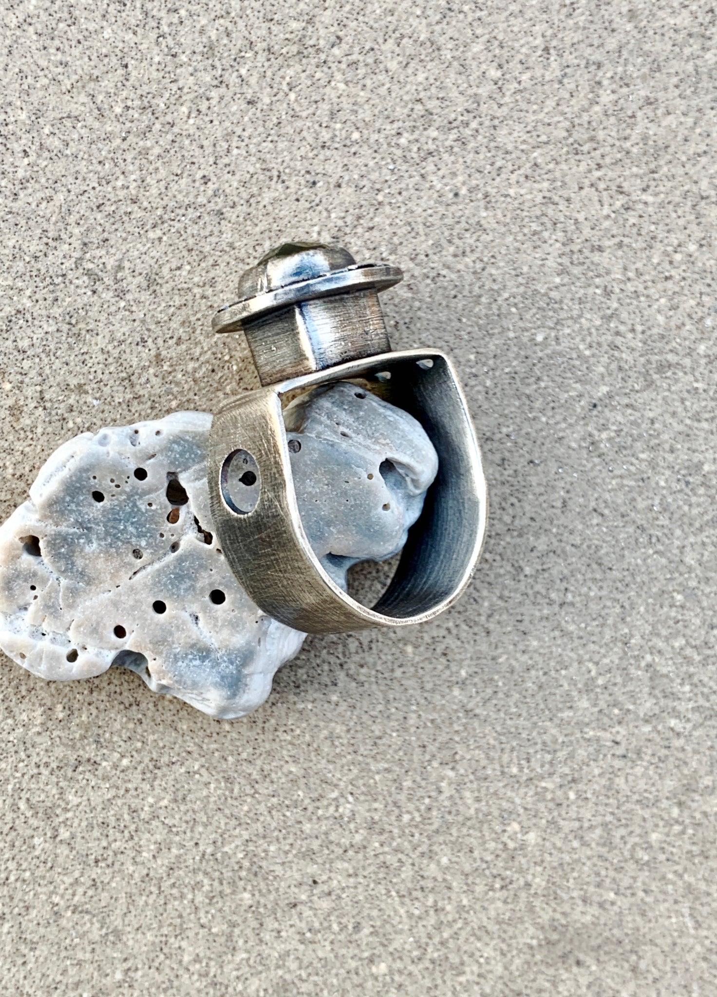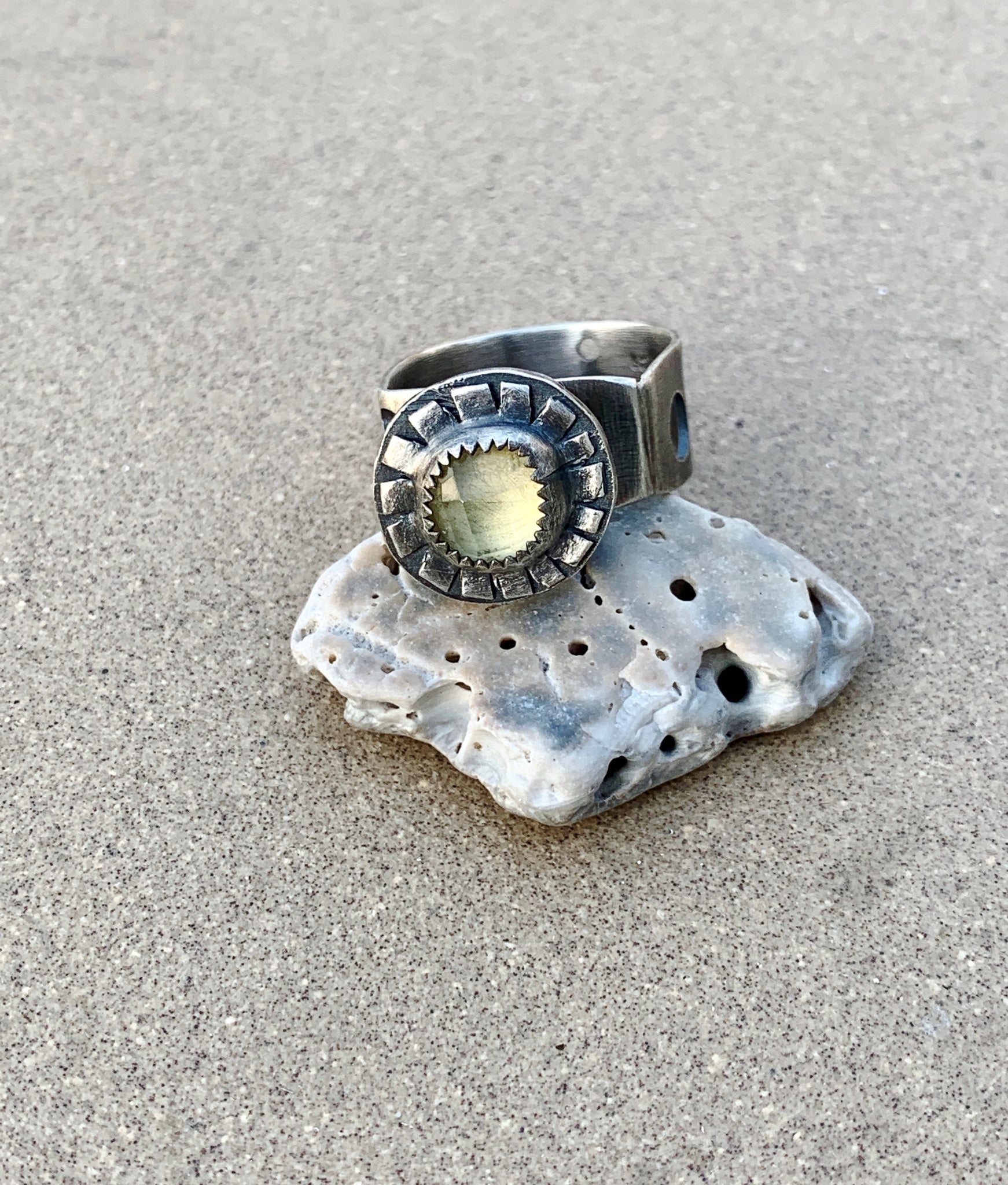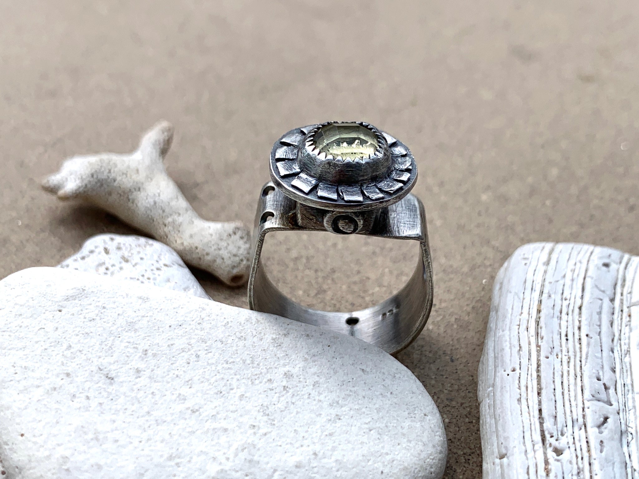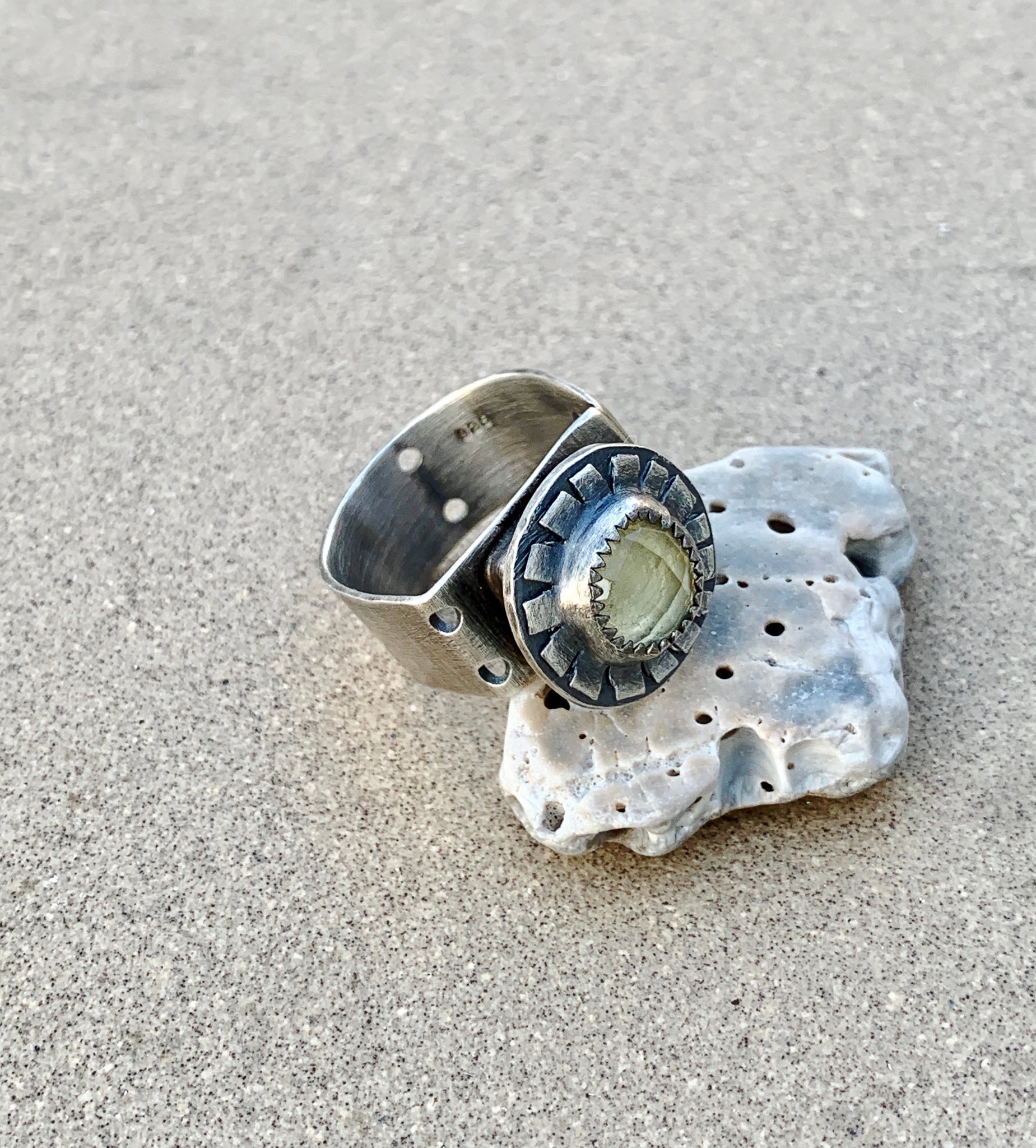 Sterling Silver “Sun” Ring, wide hand cut sterling sheet band with hand drilled / sawed cut outs. Hollow form for height, made from fine sterling silver. On top is a beautiful rose cut 8mm round lemon quartz set in serrated fine sterling silver, and hand cut base. Oxidized sanded brushed finish. Best fit Size 7 / 7.5